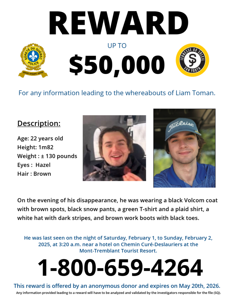 Liam was last seen on surveillance cameras leaving the bar P’tit Caribou, located on Chemin de Kandahar in Mont-Tremblant, and walking toward his hotel, La Tour des Voyageurs II. He used his phone around 3:16 a.m. and spoke with some people around 3:20 a.m. After that, instead of heading to his hotel, cameras captured him walking toward Chemin au Pied-de-la-Montagne. This is the last known sighting of Liam.